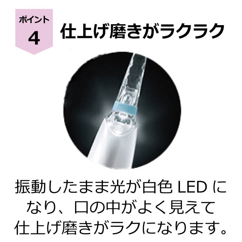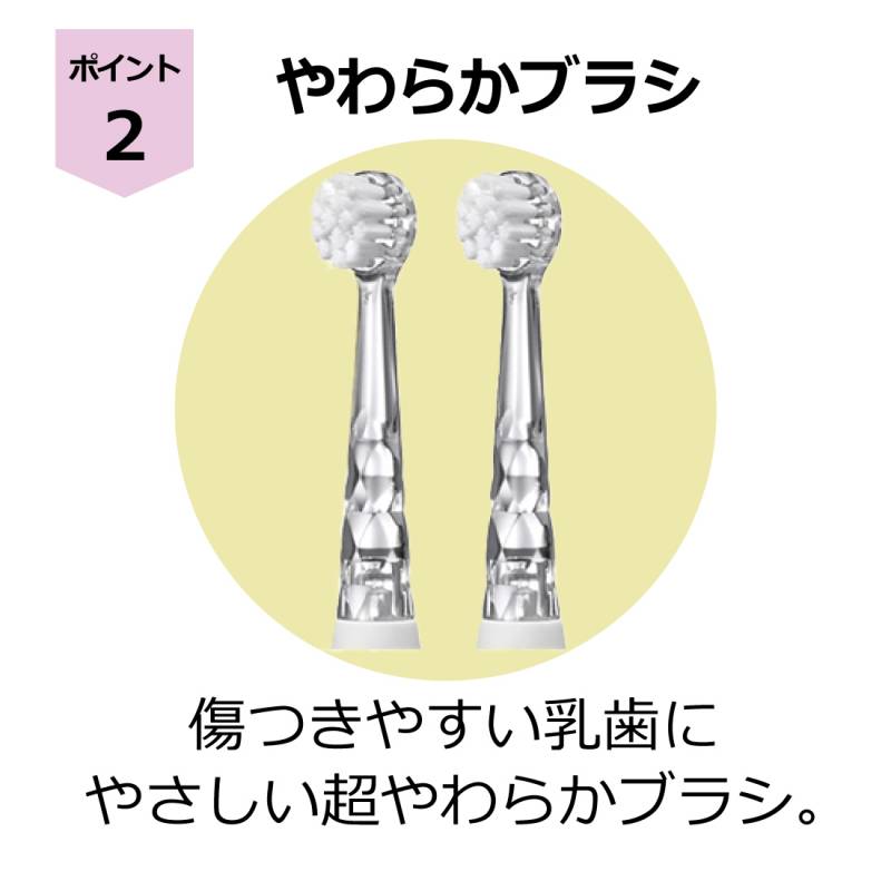 初めて歯磨きするお子様も、歯にブラシを当てるだけでしっかり汚れ除去できます。 お子様の好きな色のライトで歯が磨けるので、さらに歯磨きに興味を持たせることができます。 好きな色で止めて、磨けるようになりました。 さらにもう一度押すと、振動したまま光が白色LEDになり、口に中がよく見えて仕上げ磨きがラクになります。 使用方法 PETG、シリコン、TPE ○替えブラシ:(柄)PETG、TPE、(毛)Nylon" |